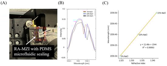 We next examined the sensitivity of device S, as it had the highest ER among the seven fabricated μFRA-MZI devices. To do so, various concentrations of sodium chloride (NaCl) (5%, 10%, and 15% by weight) solutions were introduced into the microfluidic channel, as shown in Figure 4A. The device was placed on the waveguide holder, and the NaCl solutions were introduced via a syringe pump, ensuring a controlled flow rate over the sensing region. As the concentration of NaCl solution increased from 5% to 15%, the resonance wavelength shifted from 1559.3 nm to 1559.5 nm (Figure 4B). The RI of NaCl solutions in the infrared region is 1.324, 1.333, and 1.342 for 5%, 10%, and 15% NaCl, respectively (calculated using the polynomial reported by [25]). We plot the resonance wavelength vs. RI at different NaCl concentrations in Figure 4C, where a linear fit provides a slope representing the sensitivity (S = ∆λ/∆n) of device S.