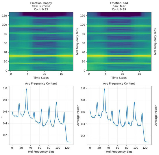 Example spectrograms (top) and corresponding average frequency content plots (bottom) for plant-based recordings aligned with human facial emotion labels. The left panels show a trial labeled as happy (raw classifier output: surprise, confidence = 0.95), and the right panels show a trial labeled as sad (raw classifier output: fear, confidence = 0.89). Spectrograms display signal power across mel-frequency bins (0–120, dimensionless mel scale) as a function of time (0–16 s, seconds). The lower panels show the averaged spectral power across time for each mel-frequency bin, in arbitrary power units.