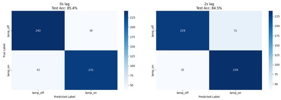 Confusion matrices for ResNet lamp on/off detection at 0 s and 2 s lag. Counts correspond to the number of test samples per class, with percentages annotated for clarity. A uniform 0.5 probability threshold was applied across panels. Axes (true vs. predicted) are identical to Figure 2 and include class labels and ticks.