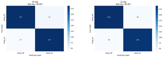 Our ResNet18 model achieved 85.4% accuracy for immediate lamp state detection (0 s lag), while comparative XGBoost analysis using numerical features achieved 85.9% accuracy at 2 s lag, representing a 1.9% improvement over the CNN approach (Table 1). Both methods demonstrated balanced precision (0.85–0.86) and recall (0.84–0.86) across lamp states, confirming robust classification performance independent of feature extraction methodology (Figure 2 and Figure 3).