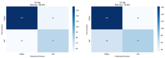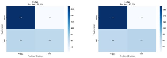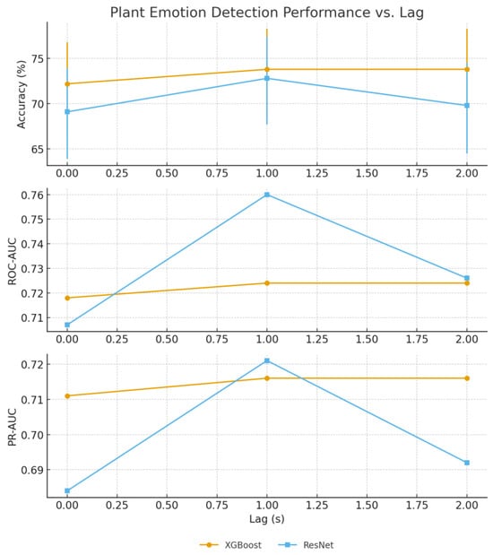 Human emotion classification demonstrated optimal performance at 1 s lag for both approaches; ResNet18 achieved 73% accuracy while XGBoost reached 73.8% accuracy, confirming temporal delay patterns through independent methodological validation (Table 3 and Figure 4, Figure 5 and Figure 6). The convergence of results across different feature extraction strategies strengthens evidence for genuine temporal relationships in plant–human interaction phenomena.