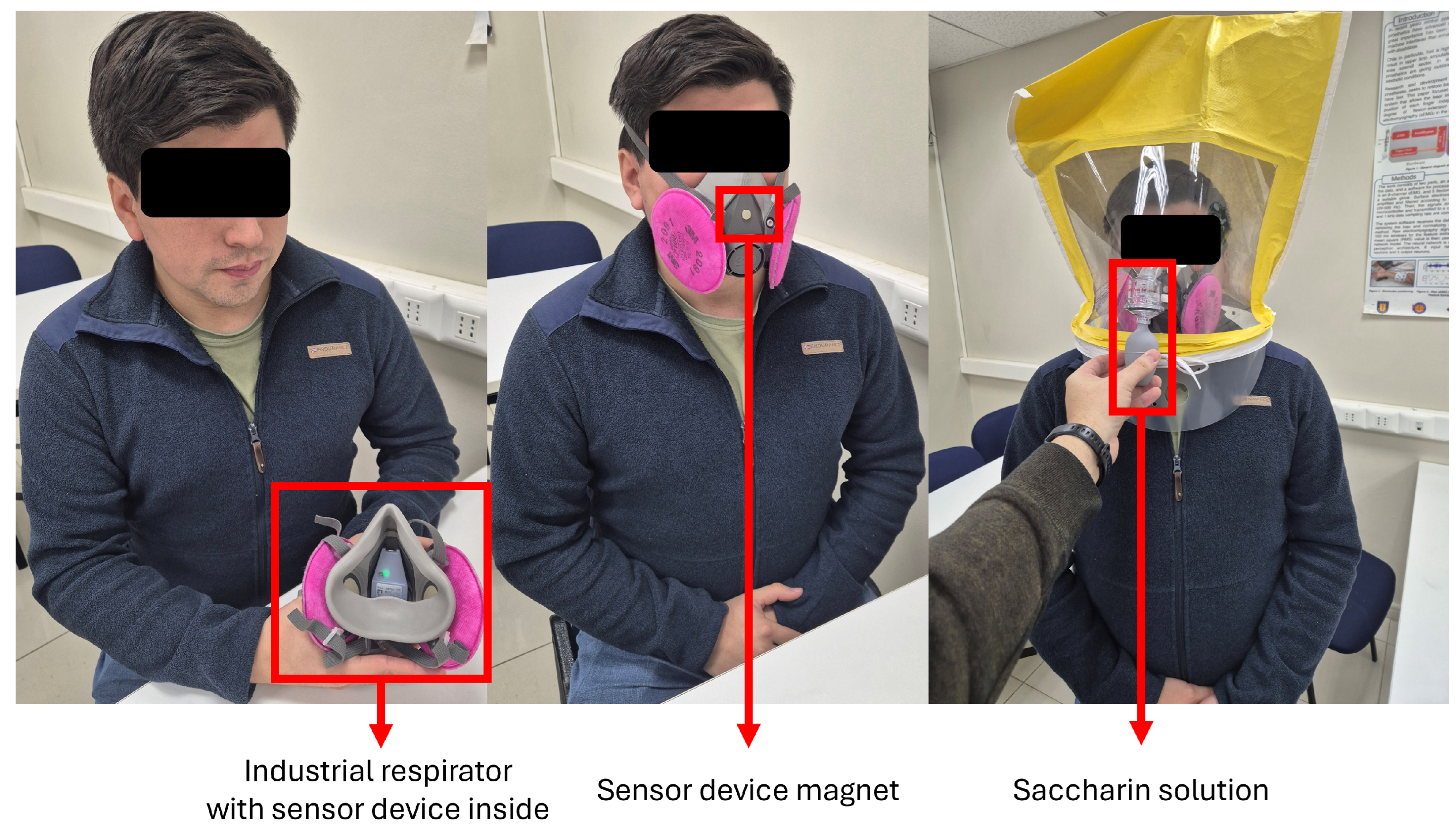 - Qualitative Assessment: A certified supervisor conducts OSHA-standardized qualitative fit tests [3] using a saccharin aerosol delivered via the 3M™ FT-20 kit [27]. The protocol evaluates the respirator’s ability to maintain a proper seal through a sequence of activities (e.g., breathing, head movement, speaking, bending over), each lasting 1 min. Detection of the sweet-tasting aerosol by the user at any point classifies the condition of the respirator as poor fit, while the absence of taste throughout all test steps confirms a well-fit condition.