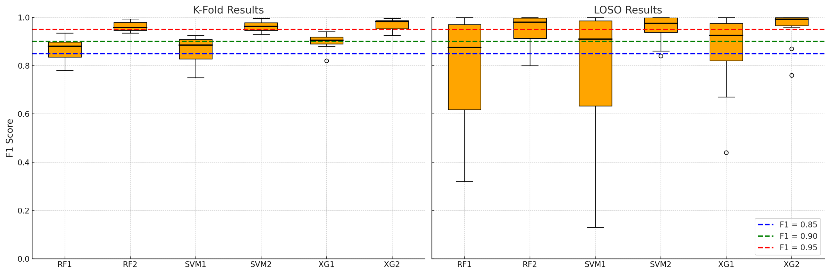 - Leave-One-Subject-Out (LOSO) Cross-Validation: Simulated deployment scenarios by testing the model’s ability to generalize to unseen subjects.