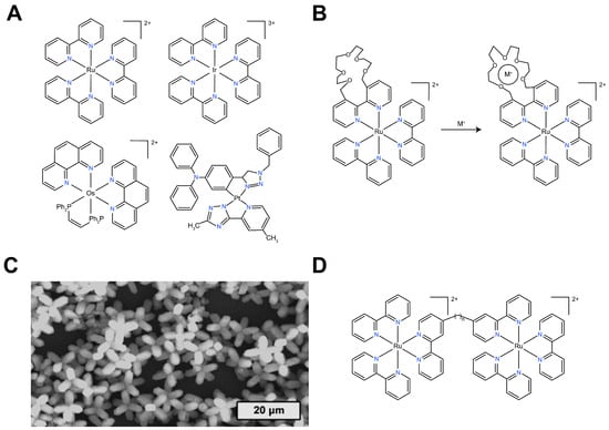 (A) Common metal–organic complex-based ECL luminophores; (B) modification of specific functional groups on the ligands of Ru(bpy)32+; (C) SEM of supramolecular assemblies of Ru(bpy)32+ []; (D) ECL luminophore based on multi-center Ru(II) organic complexes.