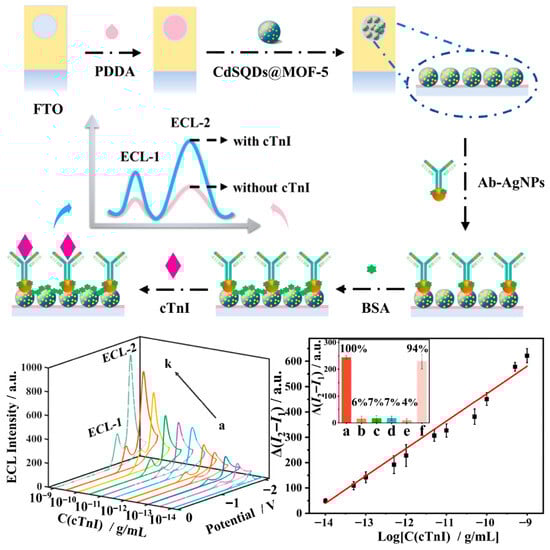 The third strategy is the differential processing method, which is based on the difference between two potential-resolved ECL signals (ΔI = I1 − I2), establishing a differential detection strategy. By utilizing the signal difference, this method can eliminate cumulative errors caused by environmental changes (e.g., temperature fluctuations), matrix variations, pH fluctuations, and other factors. Dexin Du and co-workers constructed a CdS@MOF-5 ECL system by encapsulating CdS quantum dots within MOF-5 nanomaterials to obtain potential-resolved ECL luminophores. Under a single cyclic voltammetry scan, this system generated dual-color ECL emissions at −1.0 V (λ = 525 nm, CdS band-edge emission) and −1.4 V (λ = 650 nm, MOF defect-state emission). Based on this, a label-free differential ECL immunosensor was developed for the highly sensitive detection of cardiac troponin I in clinical serum samples (Figure 8) [], providing a new direction for ECL sensor research and advancing the development of biomarker analysis and detection.