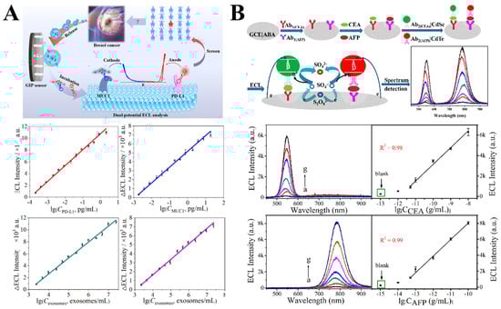 (A) Potential-resolved sandwich immunosensor for simultaneous detection of two biomarkers []; (B) wavelength-resolved sandwich immunosensor for simultaneous detection of two biomarkers []. Blank represents the control group without detection target.