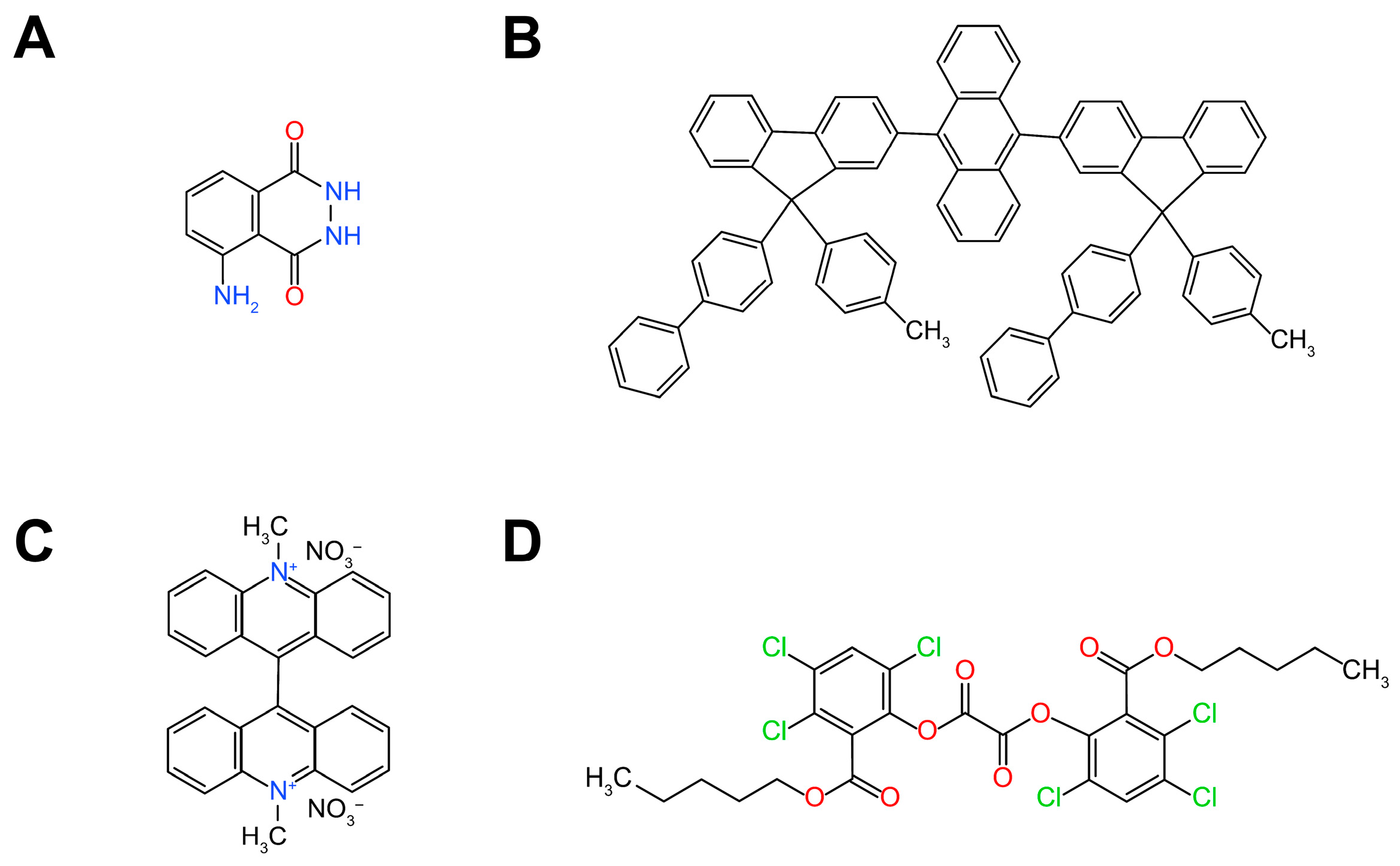 - Tzani, M.A.; Gioftsidou, D.K.; Kallitsakis, M.G.; Pliatsios, N.V.; Kalogiouri, N.P.; Angaridis, P.A.; Lykakis, I.N.; Terzidis, M.A. Direct and Indirect Chemiluminescence: Reactions, Mechanisms and Challenges. Molecules 2021, 26, 7664. [Google Scholar] [CrossRef]