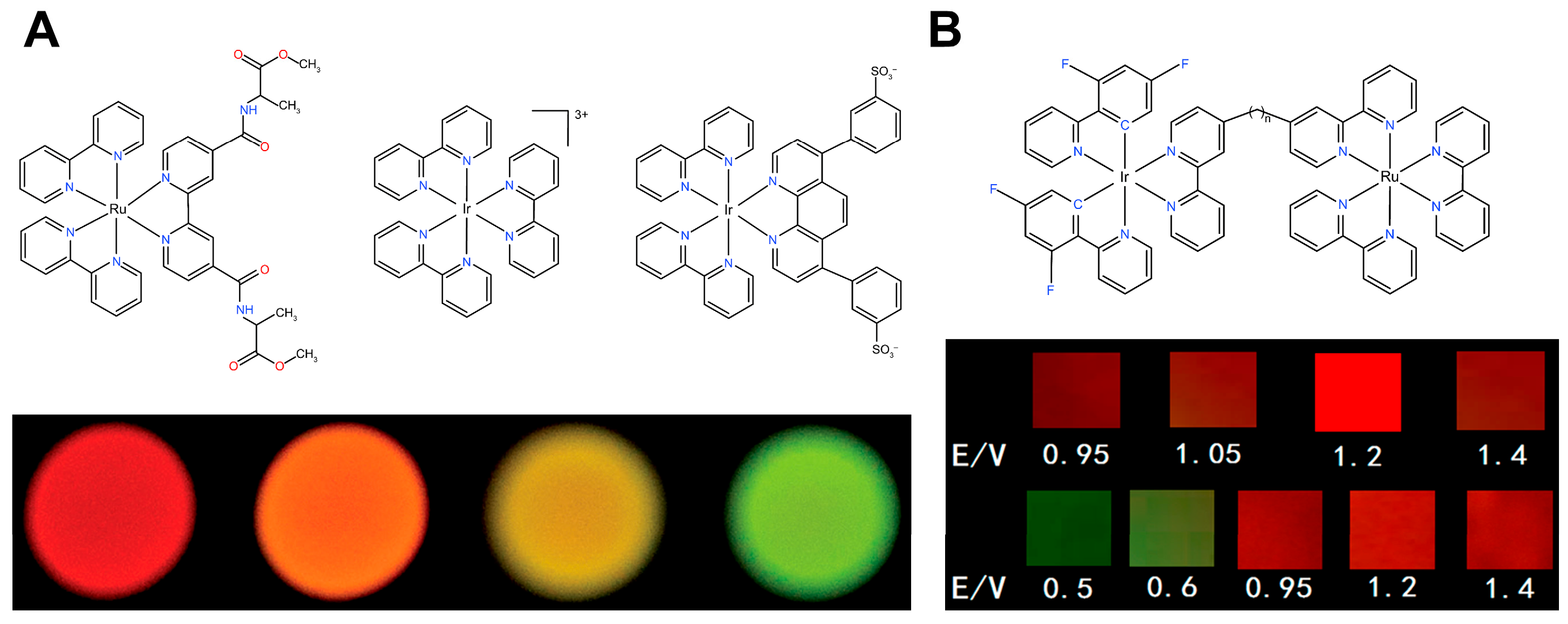 - Sun, W.; Sun, S.; Jiang, N.; Wang, H.; Peng, X. Tuning the electrochemiluminescence color by potential: Design of a series of heterodinuclear Ir/Ru labels. Organometallics 2015, 34, 3385–3389. [Google Scholar] [CrossRef]