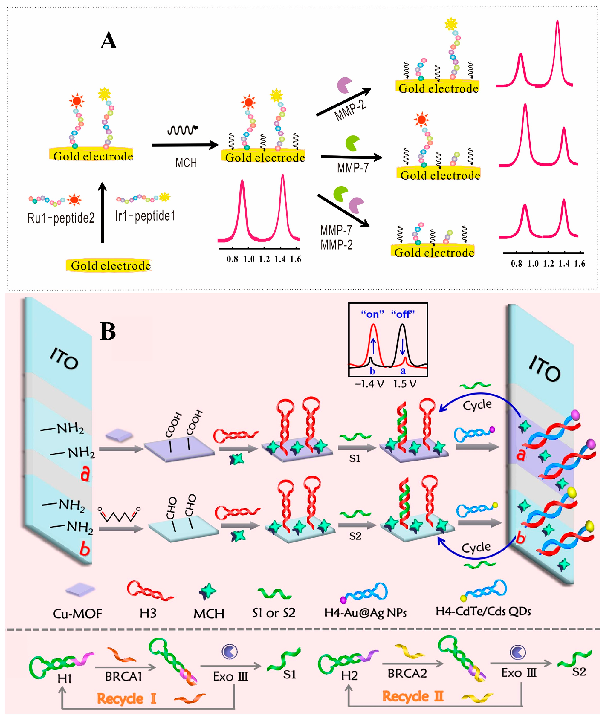 - Gao, H.; Dang, Q.; Xia, S.; Zhao, Y.; Qi, H.; Gao, Q.; Zhang, C. Highly selective electrogenerated chemiluminescence biosensor for simultaneous detection of matrix metalloproteinase-2 and matrix metalloproteinase-7 in cell secretions. Sens. Actuators B Chem. 2017, 253, 69–76. [Google Scholar] [CrossRef]