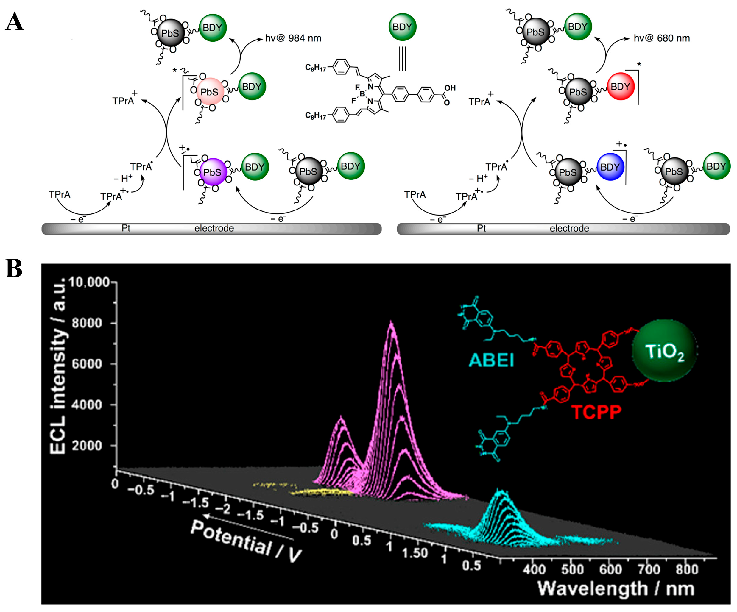 - Hesari, M.; Swanick, K.N.; Lu, J.-S.; Whyte, R.; Wang, S.; Ding, Z. Highly Efficient Dual-Color Electrochemiluminescence from BODIPY-Capped PbS Nanocrystals. J. Am. Chem. Soc. 2015, 137, 11266–11269. [Google Scholar] [CrossRef] [PubMed]