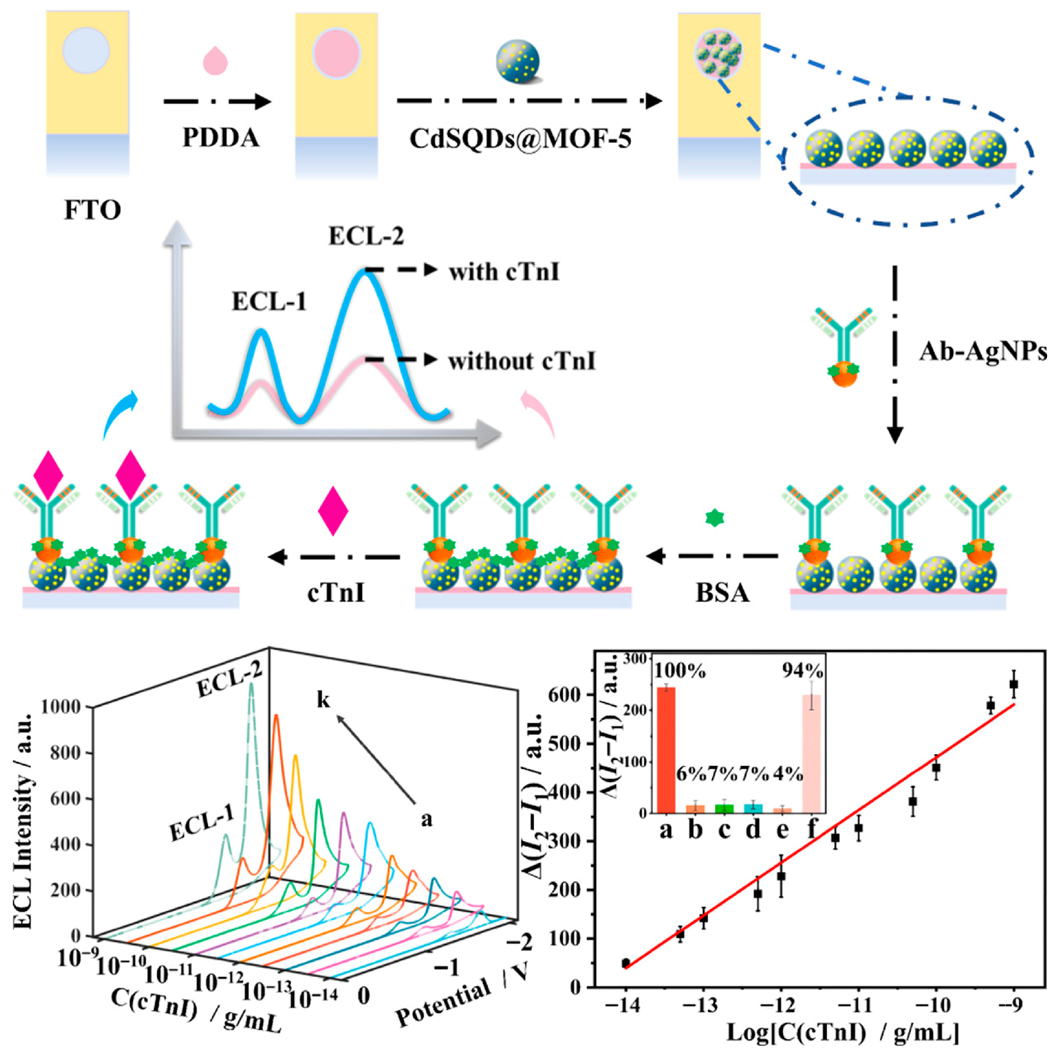 - Du, D.; Shu, J.; Guo, M.; Haghighatbin, M.A.; Yang, D.; Bian, Z.; Cui, H. Potential-resolved differential electrochemiluminescence immunosensor for cardiac troponin I based on MOF-5-wrapped CdS quantum dot nanoluminophores. Anal. Chem. 2020, 92, 14113–14121. [Google Scholar] [CrossRef]