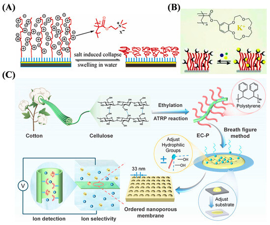 (A) Schematic illustration of reversible conformational change of surface-tethered cationic polyelectrolyte brush [45]. Copyright 2007 American Chemical Society. (B) Schematic illustration for synthesis of benzo-15-crown-5-functionalized polymer brush via SI-ATRP [46]. Copyright 2010 Wiley-VCH. (C) Schematic illustration of ordered nanoporous cellulose-based membrane for ion detection [50]. Copyright 2025 Royal Society of Chemistry.
