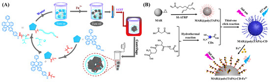 (A) Schematic illustration for the synthesis of DPDHR-PNIPAM for Fe3+ sensing [51]. Copyright 2020 Elsevier. (B) Schematic illustration of Fe3+ sensing with bi-functional MAR@poly(TAPA)-CD based on fluorescence quenching [52]. Copyright 2023 Elsevier.