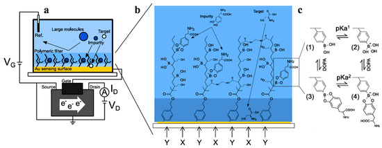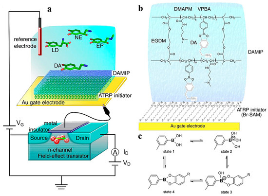(a) Schematic diagram of DA–MIP-coated gate FET. (b) Chemical composition of DA–MIP coated by SI-ATRP on Au electrode. (c) Equilibrium between PBA derivative and diol compound [74]. Copyright 2018 Elsevier.