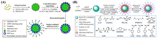 (A) Schematic protocol for the preparation of QD-labeled hydrophilic MIP microparticles [79]. Copyright 2016 American Chemical Society. (B) Schematic illustration for the preparation of red CdTe QD-labeled fluorescent 2,4-D-MIP microspheres with surface-grafted PEG brushes via one-pot SI-ARGET ATRP and chemical structures of some reagents utilized in this work [80]. Copyright 2024 Elsevier.