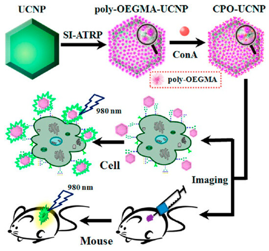 Fluorescence imaging in the near-infrared (NIR) window can enable deep-tissue imaging with high resolution and improved contrast due to the reduced light scattering and tissue autofluorescence in this spectral region. He et al. prepared multifunctional magnetic nanoparticles for in vivo NIR imaging by grafting organic dyes with both excitation and emission in the NIR region on the surface of silica-coated iron oxides through the ATRP of PEGMA and GMA monomers [99]. In this method, biocompatible iron served as the catalyst for ARRP, and fluorophore CS2 was embedded into the polymer matrix by covalent coupling. Zhang et al. reported a method for labeling and imaging of cells using core–shell UCNPs prepared by the ATRP of hydrophilic oligo(ethylene glycol) methacrylate (OEGMA) monomers (Figure 9) [100]. The polymer layer could reduce the risk of crystal structure/surface morphology changes in the UCNPs and facilitate the immobilization of the lectin concanavalin A (ConA) to achieve glycan labeling. The resulting ConA-polyOEGMA-UCNPs (CPO-UCNPs) were successfully used to label highly metastatic hepatocellular carcinoma cells (HCCHM3) in vitro and image HCCHM3-inoculated mice in vivo.