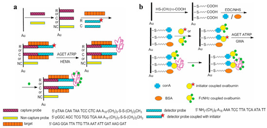 - Sun, H.; Qian, L.; Kong, J.; Zhang, X. Ultra-sensitive nucleic acid detection based on target cycling of triple helix molecular switch and ATRP double signal amplification. Sens. Actuat. B: Chem. 2021, 337, 129791. [Google Scholar] [CrossRef]