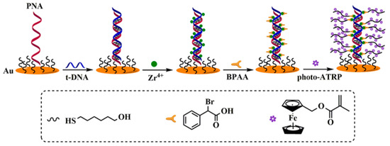 - Ma, L.; Liu, Q.; Jian, L.; Ye, S.; Zheng, X.; Kong, J. Intramolecular photoinitiator induced atom transfer radical polymerization for electrochemical DNA detection. Analyst 2020, 145, 858–864. [Google Scholar] [CrossRef]