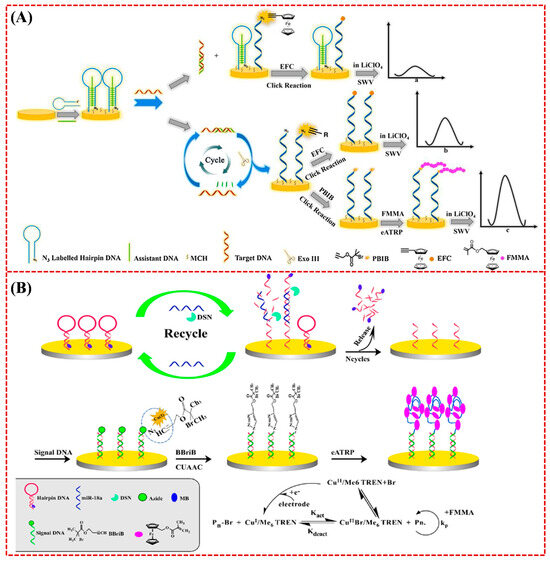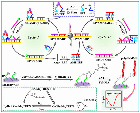- Dou, B.; Wang, K.; Chen, Y.; Wang, P. Programmable DNA nanomachine integrated with electrochemically controlled atom transfer radical polymerization for antibody detection at picomolar level. Anal. Chem. 2024, 96, 10594–10600. [Google Scholar] [CrossRef]