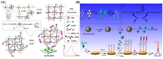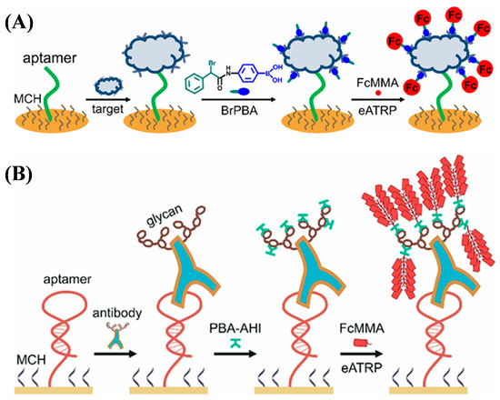 - Wang, F.; Xu, Y.; Han, H.; Ma, Z. In situ growth of electroactive polymers via ATRP to construct a biosensing interface for tumor marker. Microchim. Acta 2021, 188, 389. [Google Scholar] [CrossRef]