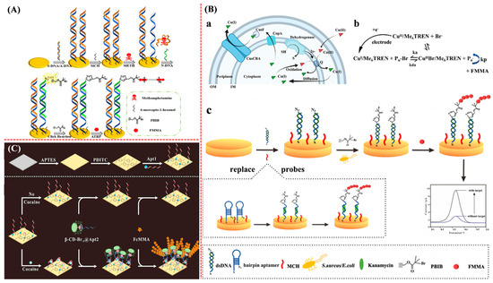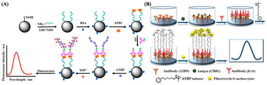 In addition to fluorescent assays, ATRP has also been used to prepare functional materials for colorimetric and SERS analysis of small molecules [87,88,89,90,91]. For example, Chen et al. reported Tc-imprinted Mn3O4 nanoparticles (DSMIP@Mn3O4) by the ATRP of ionic liquid monomers on the nanoparticle surface [87]. The DSMIP@Mn3O4 spheres with a core–shell structure exhibited high oxidase-like activity to catalyze the oxidation of 3,3′,5,5′-tetramethylbenzidine (TMB) into a blue product. Rebinding of Tc toward the DSMIP@Mn3O4 blocked the molecular channel and prevented the catalytic oxidation of TMB, thus allowing for the colorimetric assay of Tc in the linear range of 0.5–150 μM. Rong et al. prepared a SERS sensor by functionalizing GO with poly(2-(dimethylamino)ethyl methacrylate) (PDMAEMA) through the SI-ATRP technique [90]. The PDMAEMA-modified GO was quaternized to yield GO-g-qPDMAEMA and then integrated with AuNPs to form nanofilms through a water–oil interface assembly method. The nanofilms with remarkable SERS characteristics were used to detect antibiotics such as sulfamonomethoxine and enrofloxacin.