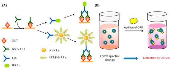 - Chen, F.; Hou, S.; Li, Q.; Fan, H.; Fan, R.; Xu, Z.; Zhala, G.; Mai, X.; Chen, X.; Chen, X.; et al. Development of atom transfer radical polymer-modified gold nanoparticle-based enzyme-linked immunosorbent assay (ELISA). Anal. Chem. 2014, 86, 10021–10024. [Google Scholar] [CrossRef]