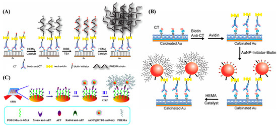 - Liu, Y.; Dong, Y.; Jauw, J.; Linman, M.J.; Cheng, Q. Highly sensitive detection of protein toxins by surface plasmon resonance with biotinylation-based inline atom transfer radical polymerization amplification. Anal. Chem. 2010, 82, 3679–3685. [Google Scholar] [CrossRef]