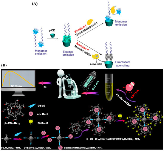 Optical sensors based on polymers and polymeric materials represent a revolutionary advancement in biomedical diagnosis and monitoring due to their unique flexibility, biocompatibility, and selective reactivity. ATRP has become one of the most widely used techniques for preparing multiblock copolymers and complex polymer structures. ATRP-based polymers and polymeric materials have been developed for the detection of small organic molecules with excellent performance. In addition, synthetic and natural macromolecules/polymers can be grafted onto the polymer skeleton to enhance the water solubility and biocompatibility of ATRP copolymers. Bismuth phosphate@GO and fluorescent polymers and MIPs labeled with dyes, quantum dots (QDs), and carbon dots have been prepared and used for sensing small molecules (Table 3) [76,77,78,79,80,81,82,83,84,85,86]. For example, Mardani et al. suggested that the fluorescent block copolymer poly(7-acryloyloxy 4-methylcoumarin-r-methyl methacrylate)-b-poly(dimethylaminoethyl methacrylate) formed by ATRP with a coumarin-containing ATRP initiator 7-(2-bromoisobutyryloxy)-4-methylcoumarin could be used for CO2 sensing [76]. The block copolymers could self-assemble into vesicular assemblies in an aqueous solution. In the presence of CO2, the thickness of the vesicular assemblies decreased, and their hydrodynamic radius increased, leading to an increase in the distance of coumarin moieties. The distance change of the coumarin moieties induced the change in the aggregation state of the copolymers and fluorescence intensity. In addition, many efforts have been put into creating organic fluorescent polymers and polymeric materials to address the key challenges in biological and medical applications. Yang et al. reported QD-labeled hydrophilic MIP microparticles for the detection of the antibiotic drug tetracycline (Tc) (Figure 7A) [79]. Alkyl bromide moieties were modified on the surface of CdTe QD–SiO2 composites for grafting Tc-imprinted polymers and poly(glyceryl monomethacrylate) brushes by SI-ATRP. Liu et al. [80] prepared hydrophilic QD-labeled fluorescent MIPs microspheres for fluorescent sensing of 2,4-dichlorophenoxyacetic acid, 2,4-D (Figure 7B). The microspheres were prepared through surface-initiated ARGET ATRP. Then, fluorescent MIPs were synthesized by one-step grafting CdTe QD-modified 2,4-D-MIPs with hydrophilic polyethylene glycol brushes onto the polymeric microspheres. In these two works, the fluorescence of QDs on the MIPs was selectively quenched by the target via the charge-transfer mechanism.