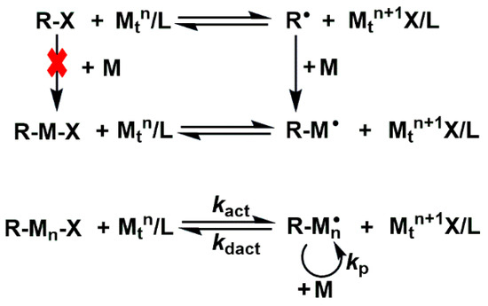 As an important type of reversible-deactivation radical polymerization (RDRP) technique, the mechanism of classical ATRP is illustrated in Scheme 1. Herein, X represents the halogen atom (such as Cl and Br) or SCN; Mtn, L, and M denote the transition-metal catalyst, ligand, and monomer, respectively. Kp is the rate constant of the polymerization reaction, Kact is the rate constant of the activation reaction, and Kdact is the rate constant of the deactivation reaction. In the ATRP reaction system, the reaction first occurs between the halogen-containing initiator (R−X) and the metal complex (Mtn/L). During the initiation stage, the low-valent metal complex Mtn/L abstracts X from R−X, generating a radical R• and a high-valent metal halide Mtn+1−X/L. The R• radical exhibits high reactivity and can attack the carbon–carbon double bond in M, thereby forming a chain radical R−M•. The newly formed chain radical R−M• shows strong reactivity, which can continue to react with surrounding M monomers. As the reaction proceeds, R−M• continuously induces the polymerization of M, gradually forming a chain-growth radical R−Mn•. Subsequently, the highly active R−Mn• can undergo a deactivation reaction with the oxidized Mtn+1−X/L, capturing X therefrom to form a relatively stable dormant species R−M−X. Meanwhile, during the deactivation reaction, the metal ion is reduced from a high-valent state to a low-valent state (Mtn+1 is reduced to Mtn), providing conditions for the activation of R−X in the next cycle. This dynamic equilibrium activation–deactivation process enables the entire polymerization reaction to proceed under relatively mild conditions and can effectively control the molecular weight and distribution of polymers, thereby allowing for the synthesis of polymers with specific structures and properties.