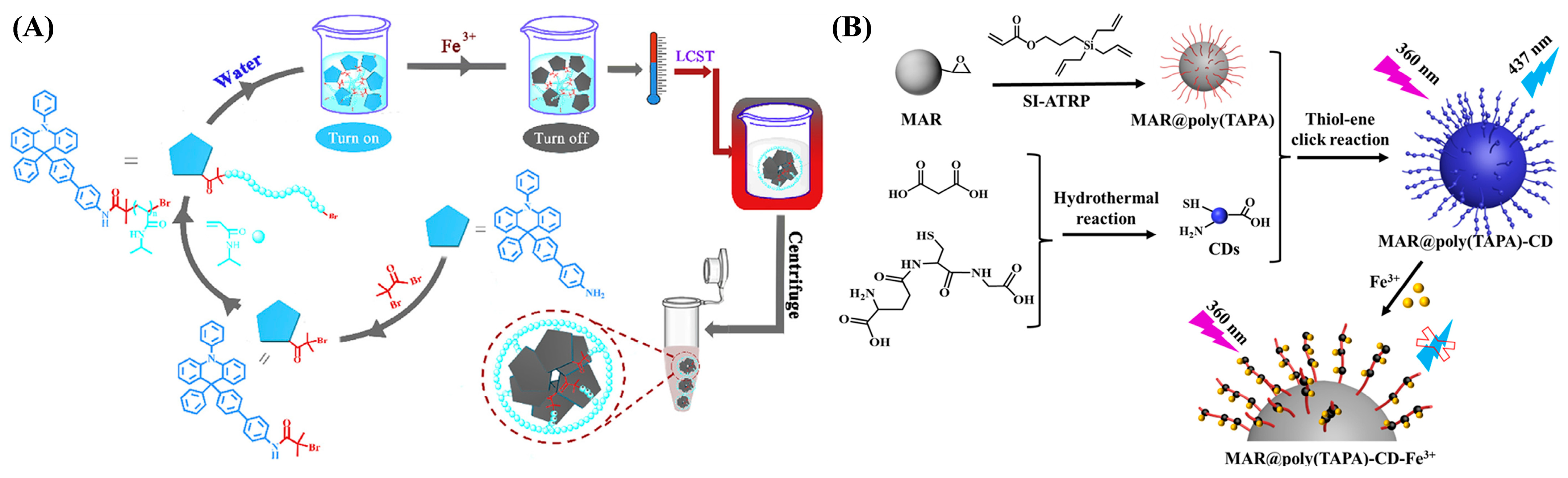 Figure 2. (A) Schematic illustration for the synthesis of DPDHR-PNIPAM for Fe3+ sensing [51]. Copyright 2020 Elsevier. (B) Schematic illustration of Fe3+ sensing with bi-functional MAR@poly(TAPA)-CD based on fluorescence quenching [52]. Copyright 2023 Elsevier.
