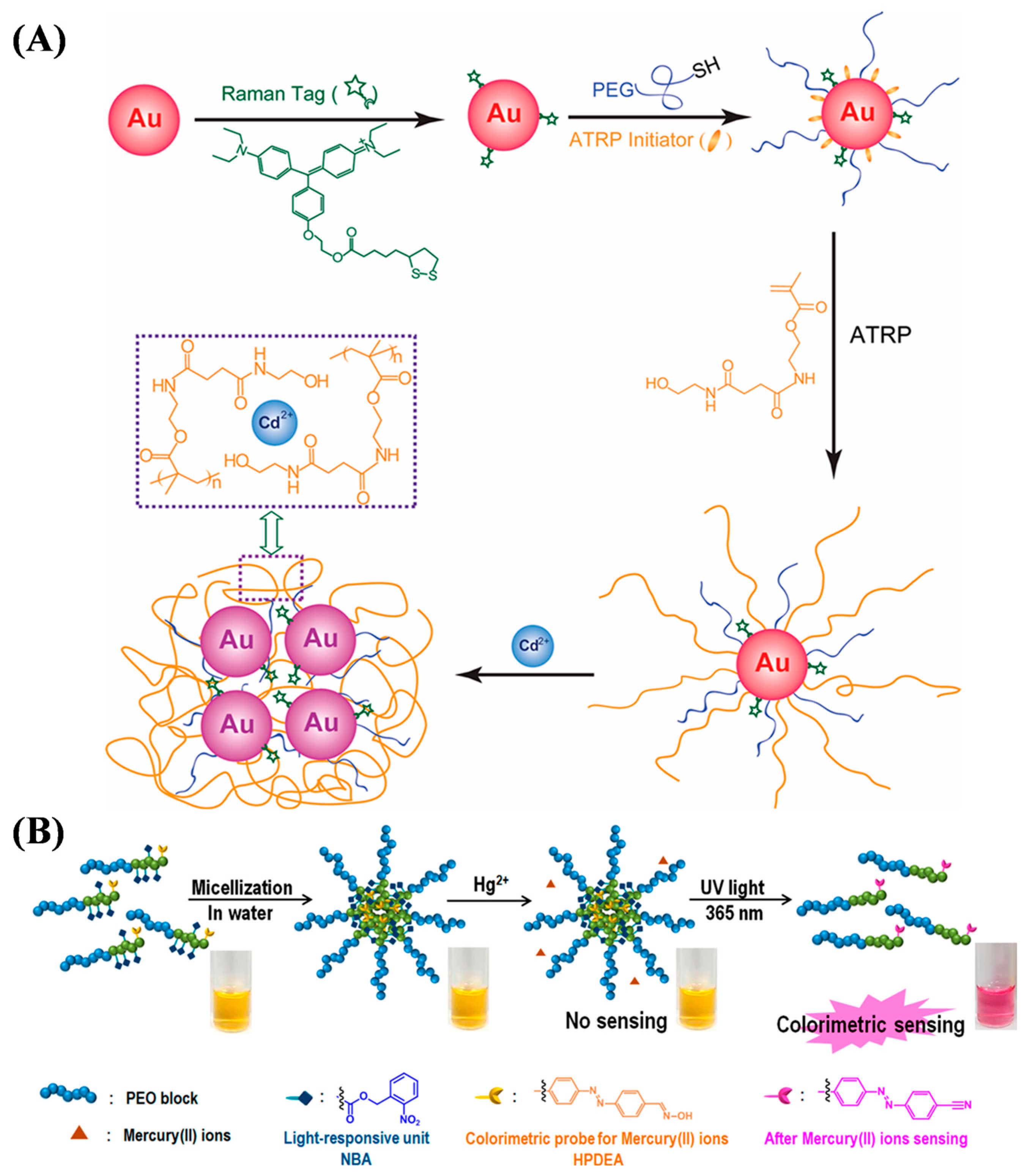 Figure 3. (A) Schematic illustration for the fabrication of SERS dye-encoded AuNPs through ligand exchange and SI-ATRP and the working mechanism for selective Cd2+ recognition and binding [56]. Copyright 2011 American Chemical Society. (B) Schematic diagram of amphiphilic block copolymer with photocleavable nitrobenzyl moiety and oxime group attached to the azo chromophore as a receptor to detect Hg2+ [57]. Copyright 2018 American Chemical Society.