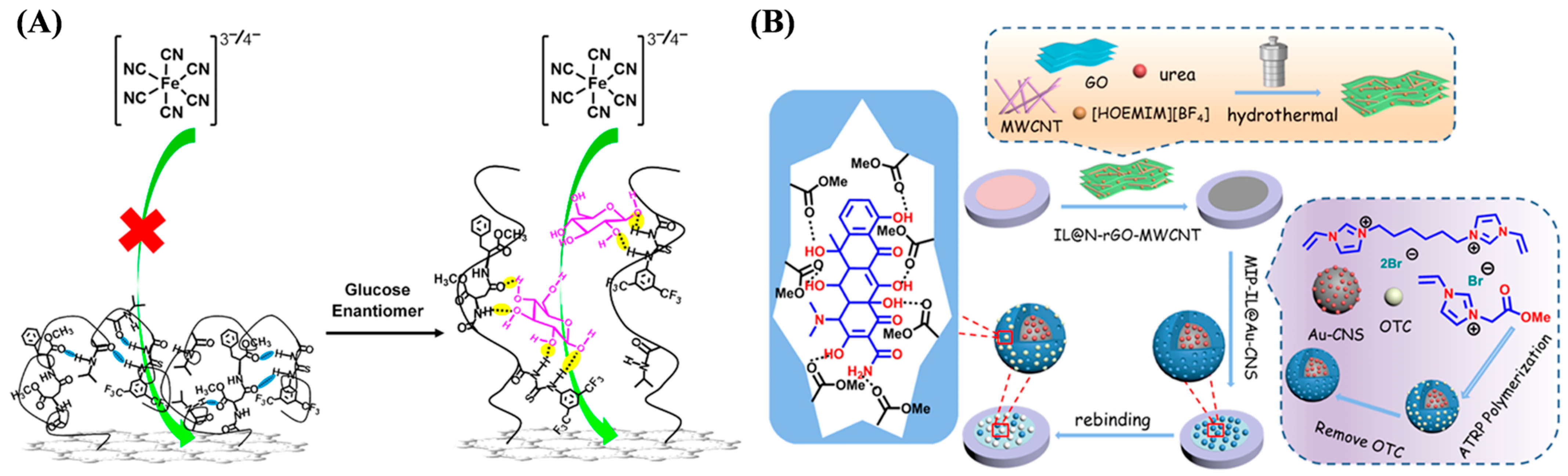 Figure 4. (A) Working principle of the electrochemical chiral sensing of monosaccharide enantiomer based on the stimuli-responsive polymer/graphene hybrid-modified screen-printed carbon electrode [68]. Copyright 2016 American Chemical Society. (B) Schematic diagram of oxytetracycline detection using surface molecularly imprinted polymer based on ionic liquid and ATRP [73]. Copyright 2022 Elsevier.