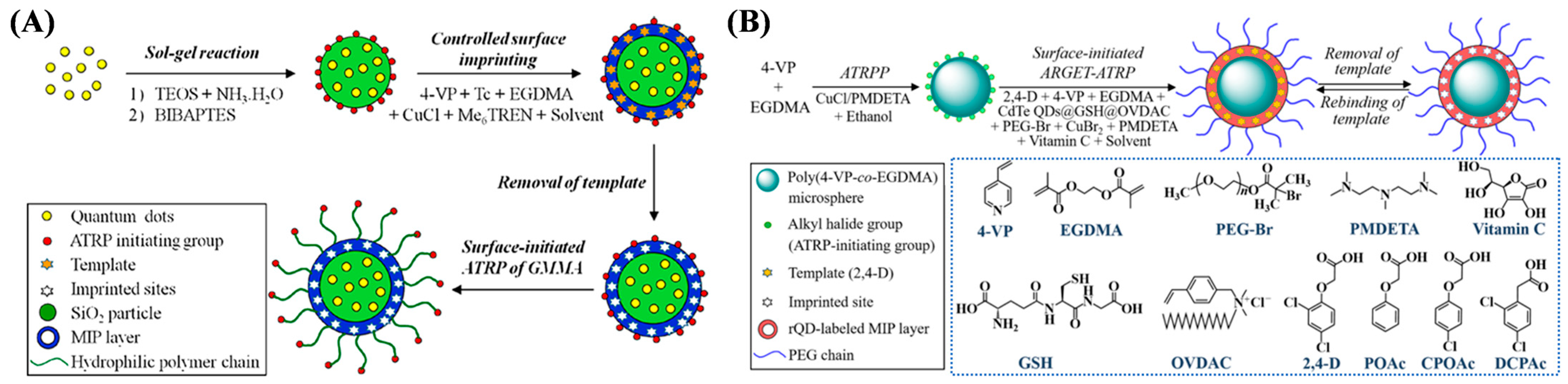 Figure 7. (A) Schematic protocol for the preparation of QD-labeled hydrophilic MIP microparticles [79]. Copyright 2016 American Chemical Society. (B) Schematic illustration for the preparation of red CdTe QD-labeled fluorescent 2,4-D-MIP microspheres with surface-grafted PEG brushes via one-pot SI-ARGET ATRP and chemical structures of some reagents utilized in this work [80]. Copyright 2024 Elsevier.