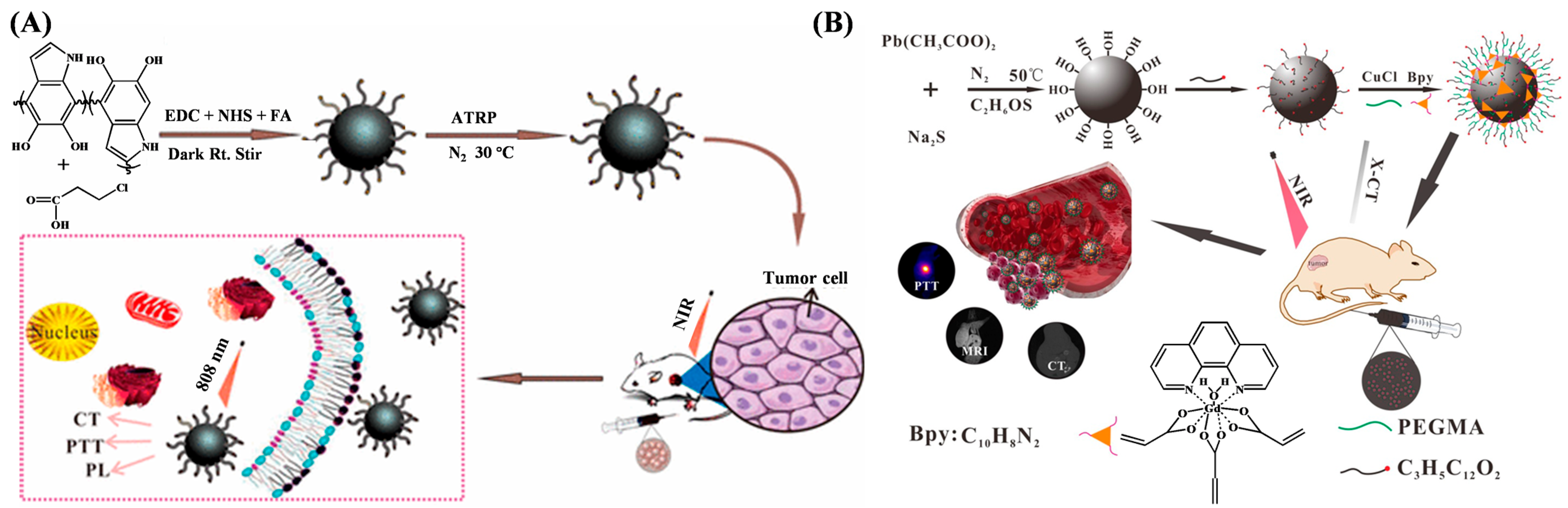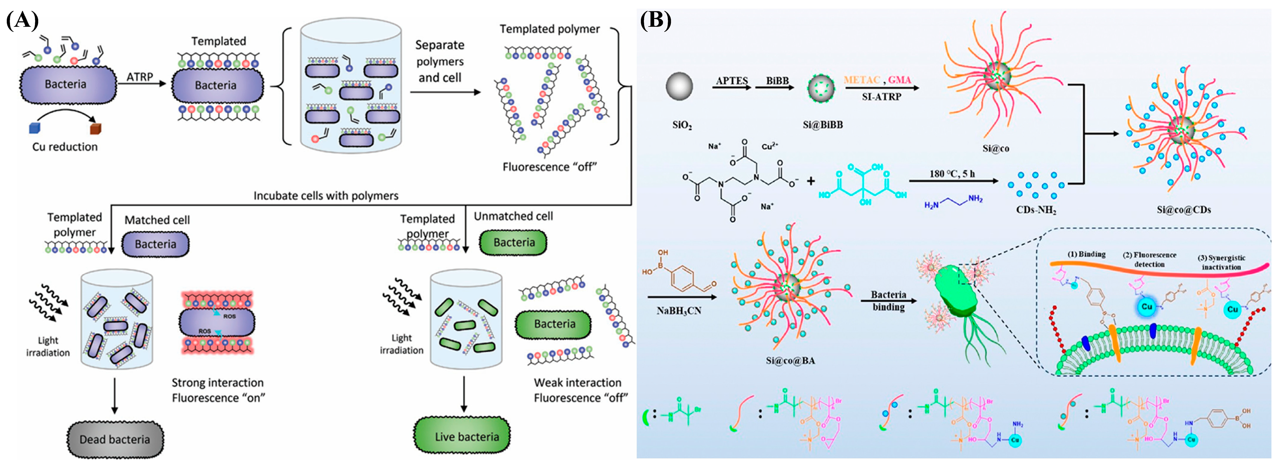 Optical imaging, especially fluorescence imaging, has attracted increasing interest in preclinical and clinical applications due to its advantages of non-invasiveness, real-time imaging, high resolution, no radiation-related risk, and low cost. Recent studies have demonstrated the feasibility of fluorescence imaging for in vivo imaging of tumor cells and bacterial and drug delivery using ATRP-based polymer materials [92,93,94,95]. However, the conventional fluorescence dyes usually show a high intrinsic background signal and readily suffer from the aggregation-caused quenching effect after polymerization. Aggregation-induced emission fluorogens (AIEgens) are nearly nonfluorescent in their molecular state but show strong luminescence in their aggregated state, showing great potential for clinical diagnostic and therapeutic applications [96]. Qi et al. prepared an acrylic polymer for self-selective binding and killing specific pathogenic bacteria with AIE characteristics using bacteria as the template by ATRP (Figure 8A) [97]. The monomers for bacterial templating included [2-(methacryloyloxy)ethyl]trimethyl ammonium chloride (TMAEMC), TMAEMC-TPAPy, and [2-(methacry loyloxy)ethyl]dimethyl-(3-sulfopropyl)ammonium hydroxide (DMAPS). TMAEMC is a permanent cation that can bind to the negatively charged bacterial cell surface. TPAPy is an AIE moiety that shows strong emission in its aggregated form. DMAPS is a zwitterionic sulfobetaine used to enhance polymer solubility and provide a spacer for cationic sections. The bacterium-templated polymers showed no fluorescence in an aqueous solution but exhibited strong emission after binding with the target bacteria. More interestingly, the AIEgens could serve as photosensitizers to produce reactive oxygen species (ROS) under light irradiation, endowing the polymers with excellent capability to selectively kill bacteria. Zhang et al. prepared multifunctional nanocomposites for bacterial binding, fluorescence imaging, and synergistic antibacterial treatment (Figure 8B) [98]. The nanocomposites were prepared by grafting cationic polymers with quaternary ammonium compounds onto SiO2 nanoparticles by ATRP, followed by incorporation of copper-doped CDs and modification of boronic acid. The cationic polymers and boronic acid groups were responsible for bacterial binding, and the CDs produced a high fluorescence signal even around bacteria, providing a novel approach for bacterial detection and synergistic treatment.