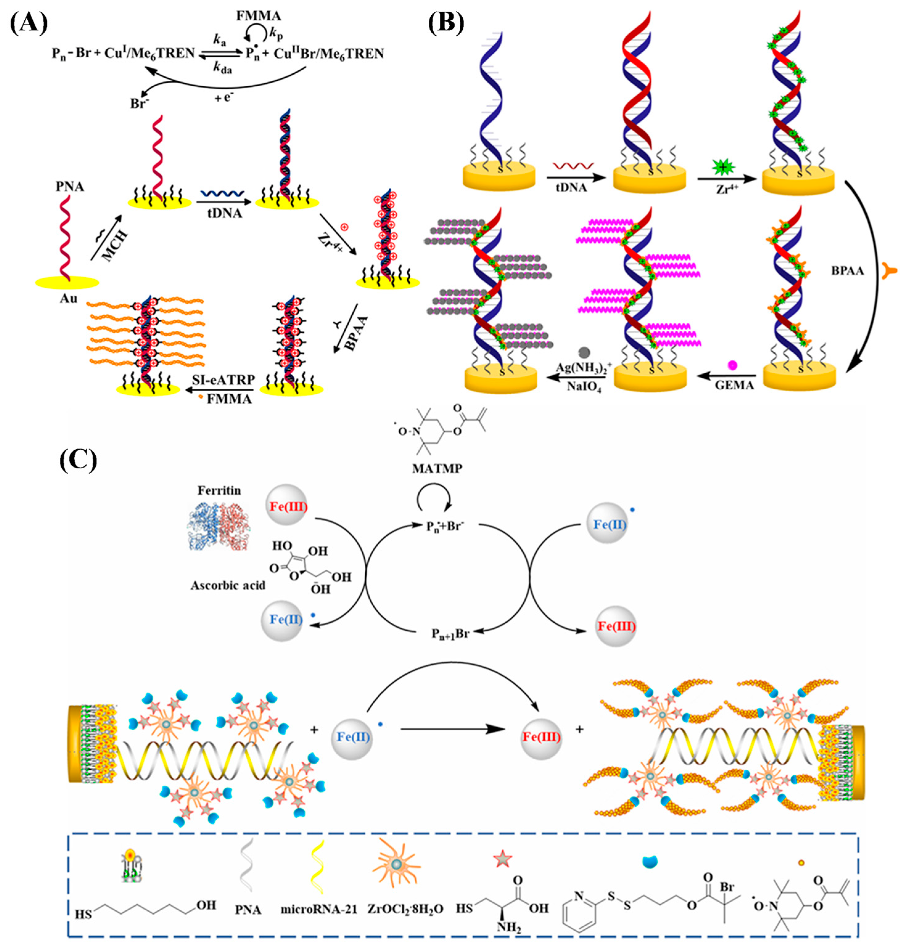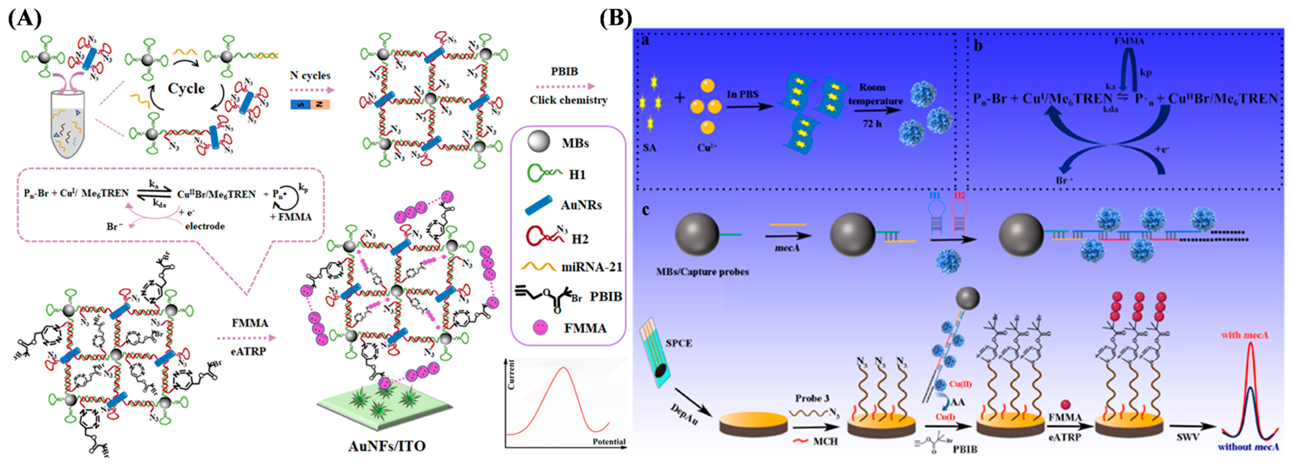 Figure 15. (A) Schematic diagram of multi-amplified platform for miRNA-21 detection [133]. Copyright 2020 American Chemical Society. (B) Schematic diagram of synthesis process of SA@Cu HNFs (a) and principle of eATRP (b), as well as magnetic separation-based electrochemical biosensing platform (c) [134]. Copyright 2025 Elsevier.