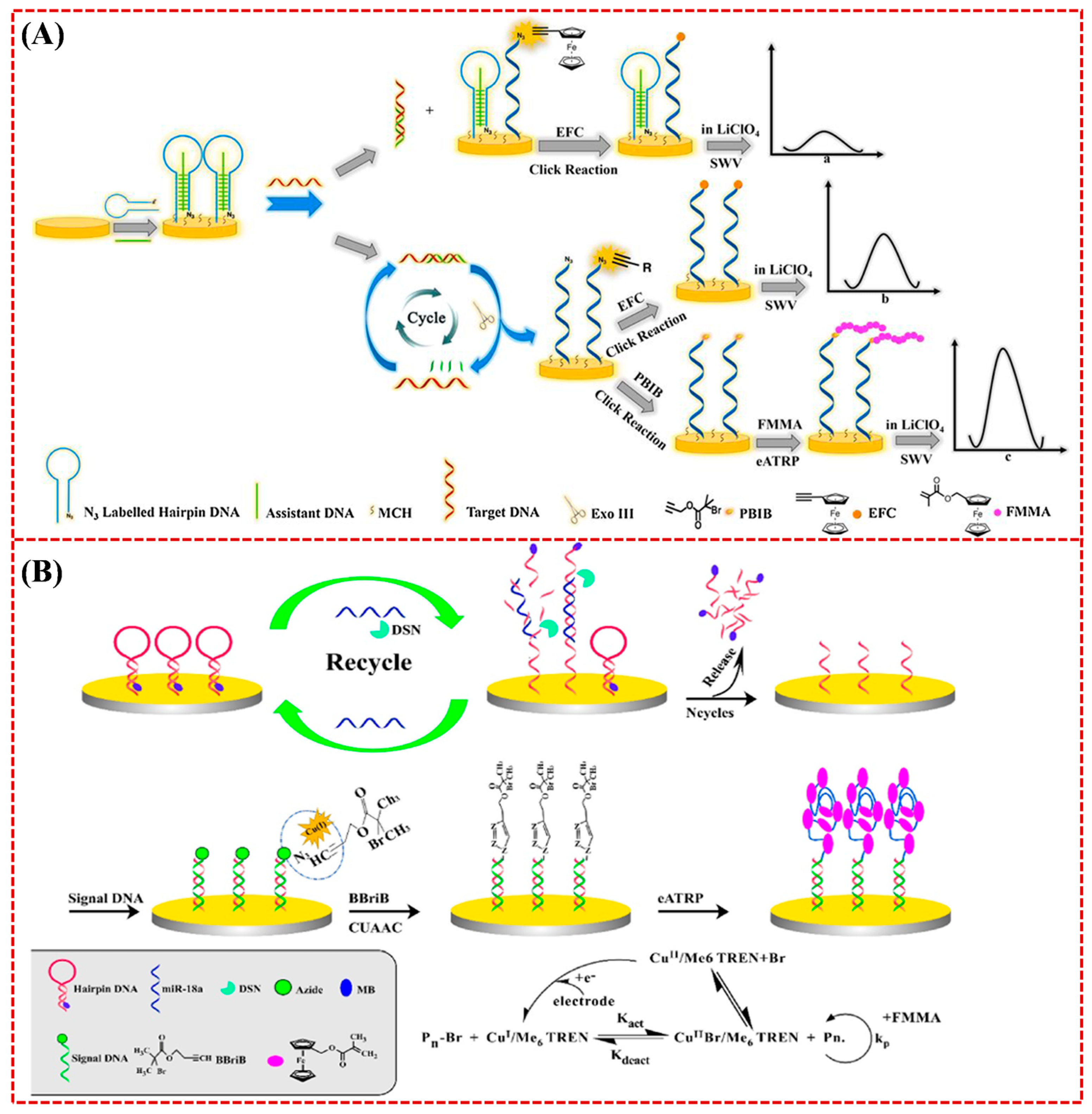 Figure 14. (A) The principle of nucleic acid detection based on Exo III-mediated target cycling and eATRP double signal amplification [129]. Copyright 2021 Elsevier. (B) Schematic of the fabrication route to the biosensor [132]. Copyright 2021 Elsevier.