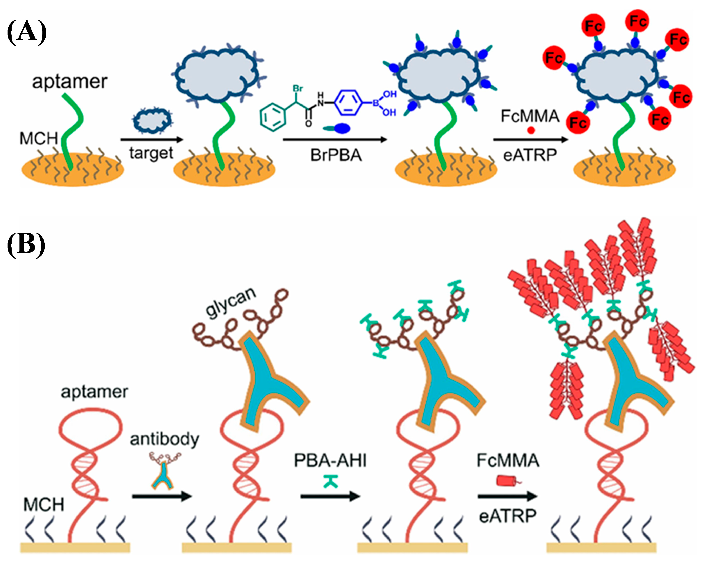 Figure 17. (A) Principle of eATRP-based electrochemical aptasensing of tumor biomarkers [146]. Copyright 2022 American Chemical Society. (B) Principle of glyGPC-based electrochemical detection of antibody pharmaceuticals [147]. Copyright 2024 American Chemical Society.