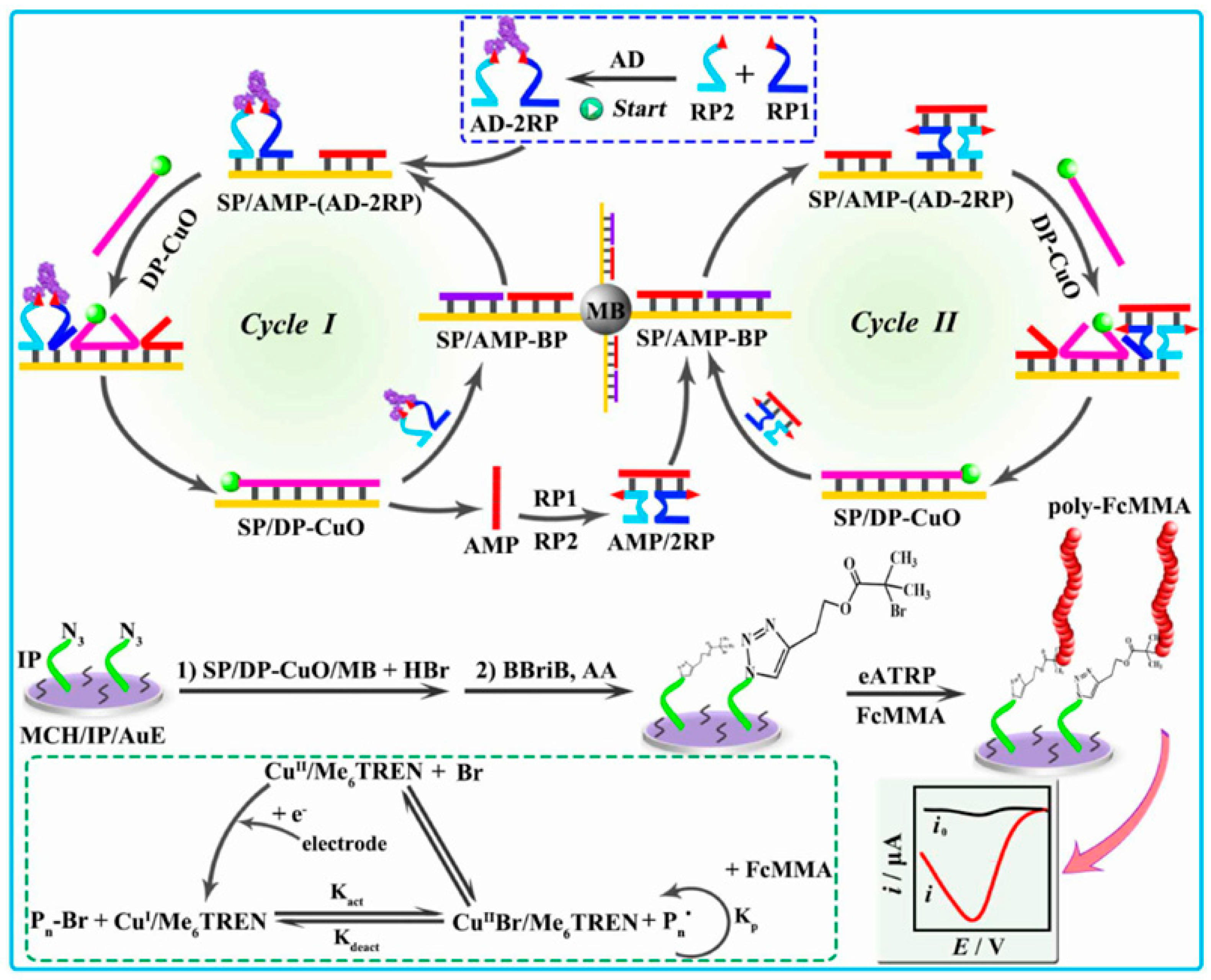 Figure 18. Schematic description of the programmable DNA nanomachine based on the combination of antibody-responsive eATRP amplification with cascaded strand displacement reaction [148]. Copyright 2024 American Chemical Society.