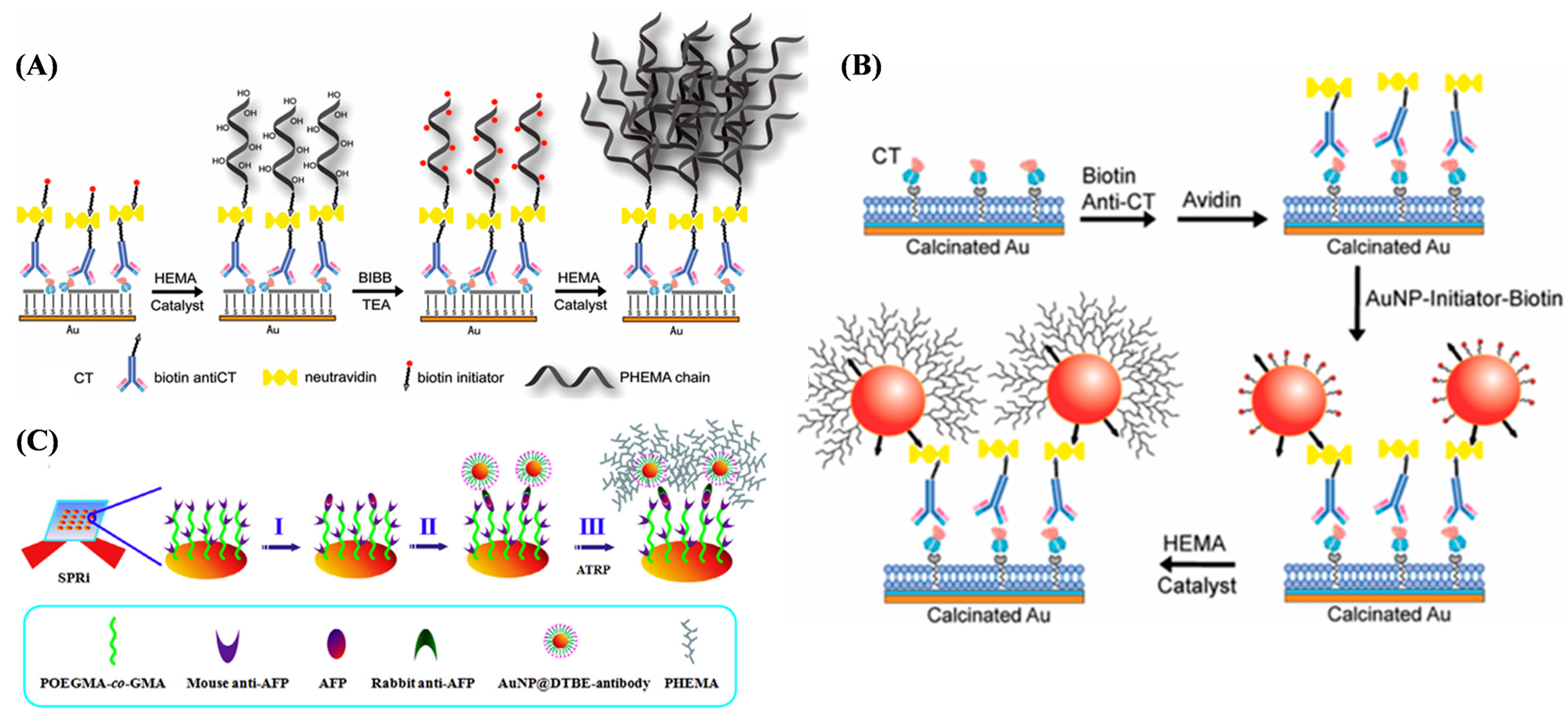 Figure 22. (A) Schematic representation of biotinylated initiator-coupled surface and consecutive two steps of in situ surface ATRP reactions for SPR signal amplification [191]. Copyright 2010 American Chemical Society. (B) Schematic representation of in situ AuNP coupling through biotin–avidin interaction and surface ATRP reaction for SPR signal amplification in CT detection [192]. Copyright 2012 American Chemical Society. (C) Dual SPRi signal amplification [193]. Copyright 2014 Elsevier. Sample was flowed on SPRi chip surface to directly detect AFP target (step I), followed by AuNPs@DTBE–antibody to form immunocomplexes for the first signal amplification (step II), and on-chip ATRP was triggered to further enhance the signal (step III).