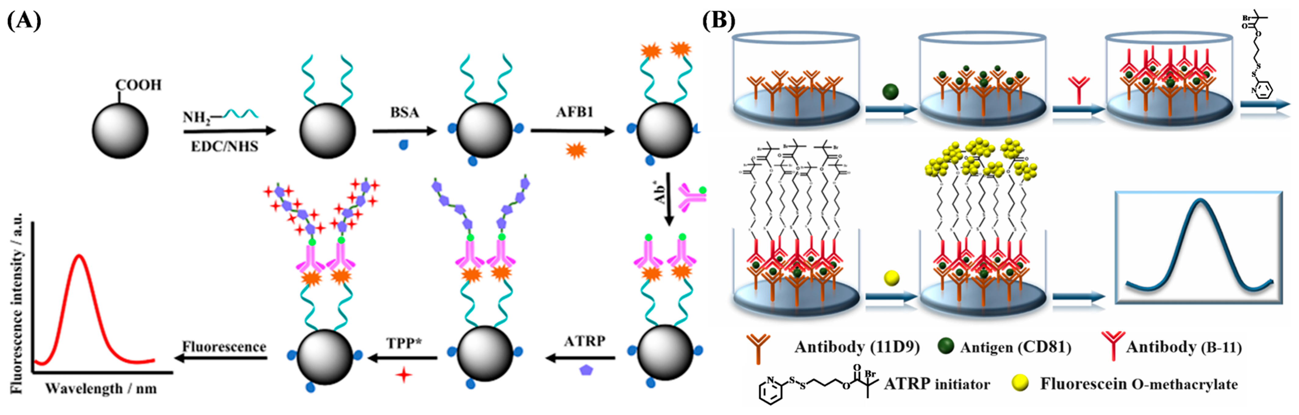 Figure 24. (A) Schematic diagram of AFB1 fluorescence sensor based on ARGET-ATRP [210]. Copyright 2022 Elsevier. (B) Fabrication process of ELISA sensors prepared by amplifying fluorescence signals via immuno-ATRP assay [211]. Copyright 2024 American Chemical Society.