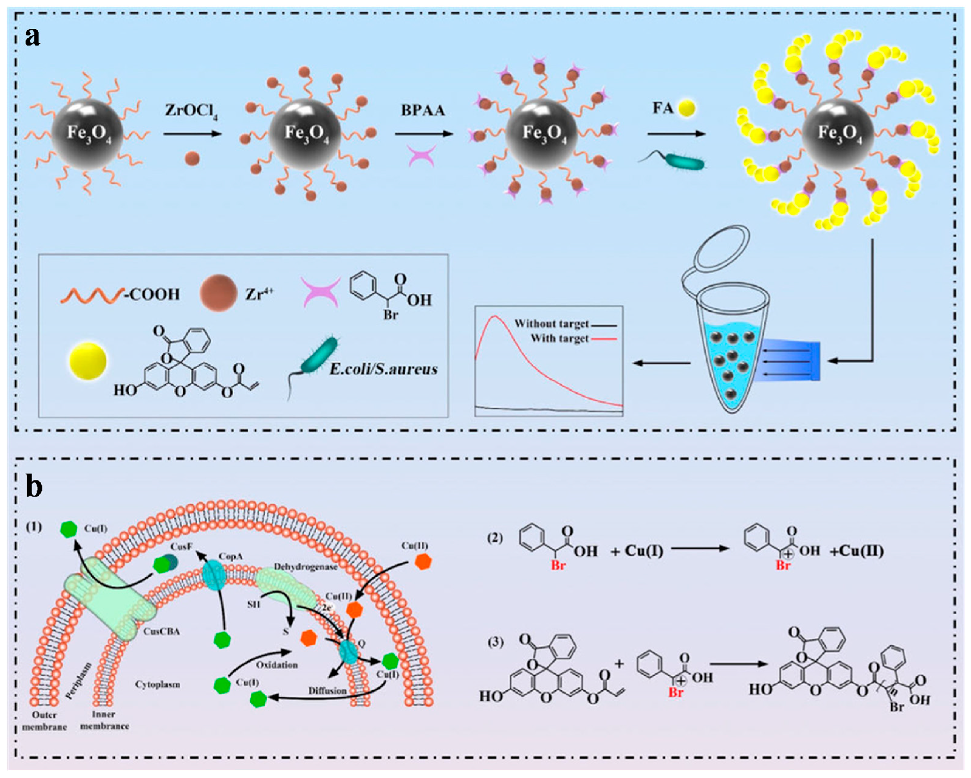 Figure 26. (a) Schematic representation of an ultra-sensitive fluorescence biosensor based on bacteria-instructed ATRP polymerization for monitoring foodborne pathogens. (b) Schematic representation of bacteria-instructed ATRP progression [214]. Copyright 2024 Elsevier.