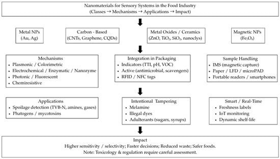 Overview of major nanomaterial classes used in food-industry sensory systems, typical detection modes, and representative applications.