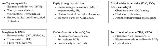 Building on Table 2, Figure 2 maps six representative nanomaterial classes to their principal sensing roles in food analysis: (a) Au/Ag nanoparticles—plasmonic colorimetry (LSPR shift/aggregation) and nanozyme-assisted colorimetric/electrochemical readouts; (b) Fe3O4/ferrites—immunomagnetic capture (IMS) boosting amperometric/impedimetric signals and magneto-piezo (EQCM) labels; (c) metal oxides and ceramics—chemiresistive VOC/amine sensing and photoelectrochemical enhancement with antimicrobial/barrier functions; (d) graphene/CNTs—electrochemical and chemiresistive/FET platforms (DPV/EIS/chronoamperometry) for freshness markers and adulterants; (e) carbon/quantum dots—fluorescent/ratiometric probes with smartphone-readable RGB quantification; and (f) functional polymers (PDA, MIPs)—PDA blue→red transitions and impedimetric/electrochemical MIP channels.