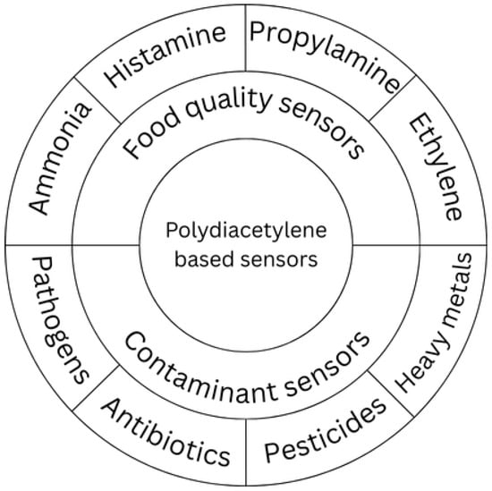 These applications are summarized in Figure 3, which categorizes PDA-based sensors according to their role in quality assessment and contaminant detection.