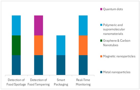 Each type of nanomaterial in Table 1 plays a role in building more responsive and informative food sensing systems. It should be noted that these categories are not mutually exclusive—many practical sensor designs combine multiple nanomaterials. For example, a nanosensor could use a hybrid material like a magnetic particle coated with gold (combining magnetic separation with plasmonic detection), or a graphene sheet decorated with silver nanoparticles to synergize electrical and antimicrobial functions. The design of nanomaterials is often tuned for the specific food matrix and analyte of interest. Organic nanomaterials (like lipid or polymer nanoparticles) may be preferred in edible or direct-contact applications due to potentially lower toxicity, whereas inorganic nanomaterials (metal, oxide, and carbon) are widely used in external sensing devices or packaging inserts for their robustness and strong signal outputs [11,25].