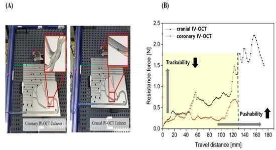Evaluation of coronary and cranial IV-OCT catheters using a simulated vessel path. (A) Schematic of the simulated vessel path (ASTM F2394) used for benchtop testing of catheter mechanical performance and (B) Graph showing the results for the resistance and distance of coronary and cranial IV-OCT catheters along the simulated vessel path. The figure and graph were generated using the same experimental setup as our previous work [], incorporating baseline mechanical data of the catheters from that study to ensure reference consistency and methodological alignment under the same ASTM F2394-based benchtop testing protocol.