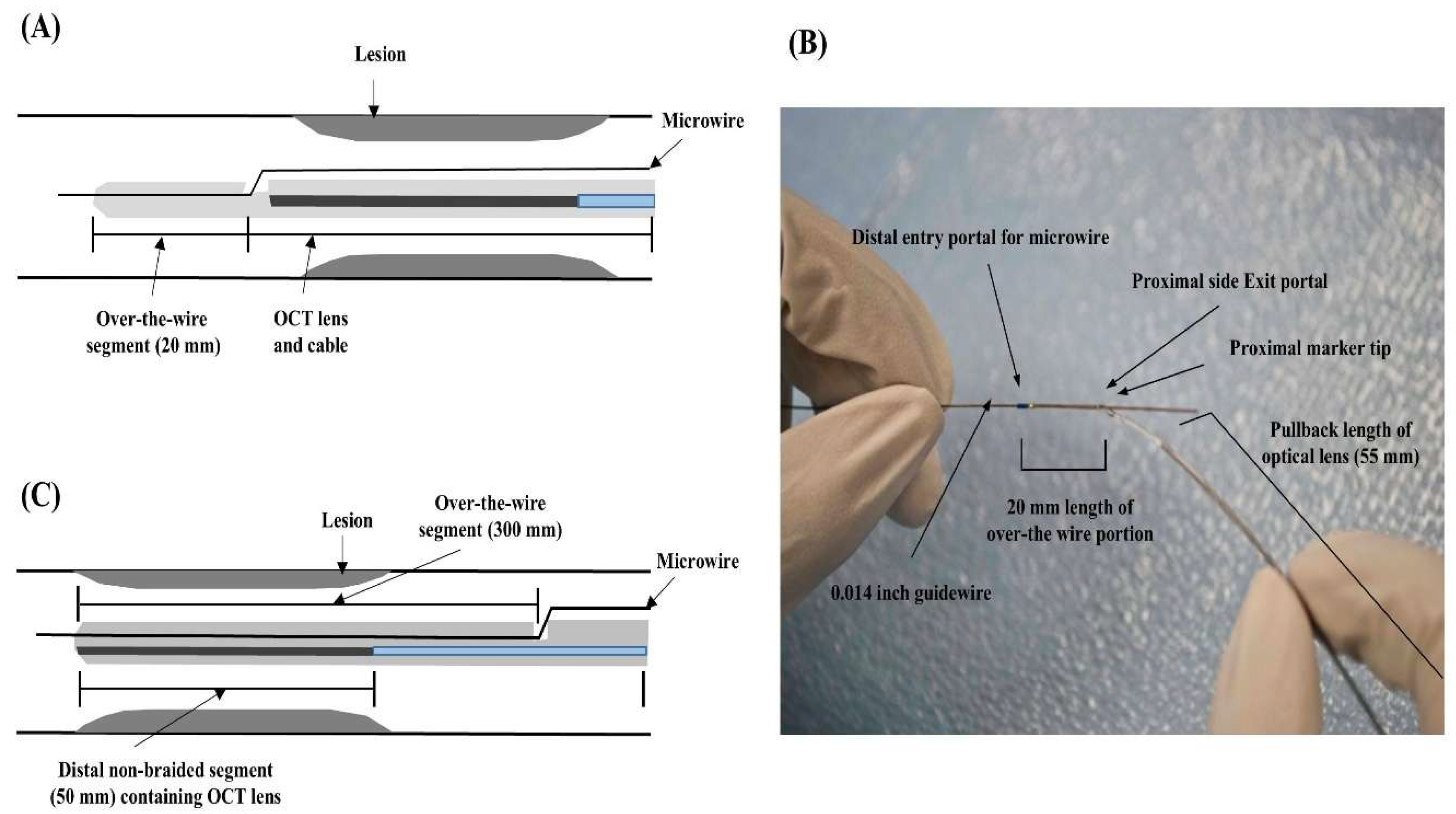 Based on this design rationale, the catheter was fabricated using established manufacturing techniques adapted to the new structural configuration. The elongated over-the-wire segment (~300 mm) was produced by precision extrusion of a polymer tube incorporating a 0.014-inch microwire lumen without a septum. The proximal 250 mm shaft was reinforced with a stainless-steel braid applied by standard braiding machinery, while the distal 50 mm segment was left non-braided to preserve OCT imaging quality. The catheter tip was thermally bonded to secure the optical fiber and lens assembly, and all joints were sealed using biocompatible medical-grade adhesives under cleanroom conditions. A hydrophilic polymer coating was subsequently applied to the external surface to reduce friction. Importantly, all fabrication steps (extrusion, braiding, bonding, coating) align with conventional catheter mass-production methods, suggesting scalability, although further process optimization, quality assurance, and regulatory validation will be required for clinical translation.