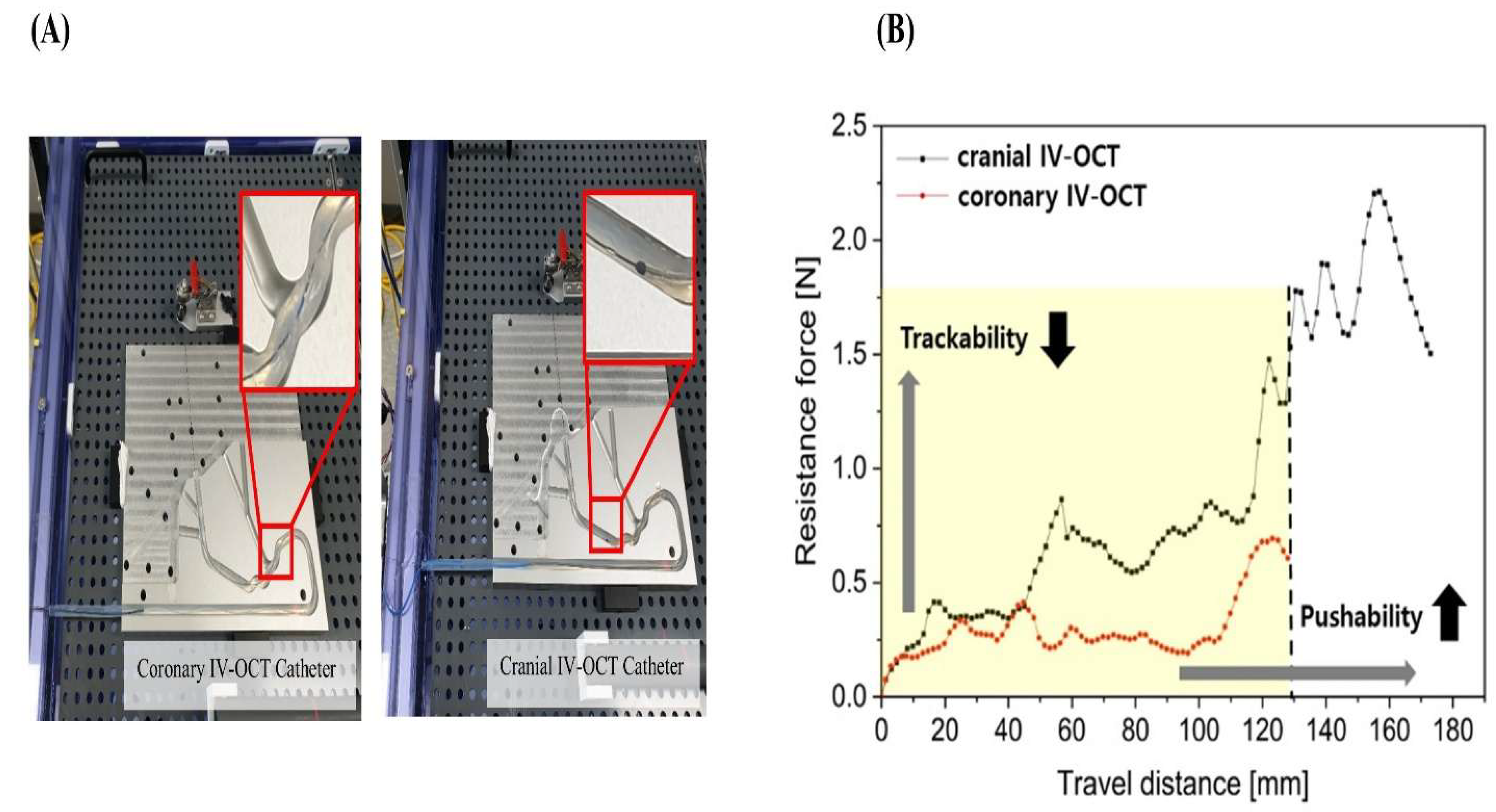 However, in vitro testing using the simulated vascular path demonstrated a 35% improvement in pushability of the modified IV-OCT catheter (172.9 ± 1.96 mm vs. 127.9 ± 2.86 mm), validating the effectiveness of the structural modifications. The increase in maximum resistance observed in the proposed IV-OCT catheter (1.47 ± 0.036 N) compared to the conventional coronary IV-OCT (0.69 ± 0.032 N) was an anticipated trade-off due to the increased rigidity associated with braided shaft. Previous studies have reported similar observations where mechanical reinforcement improves pushability at the cost of elevated frictional resistance [