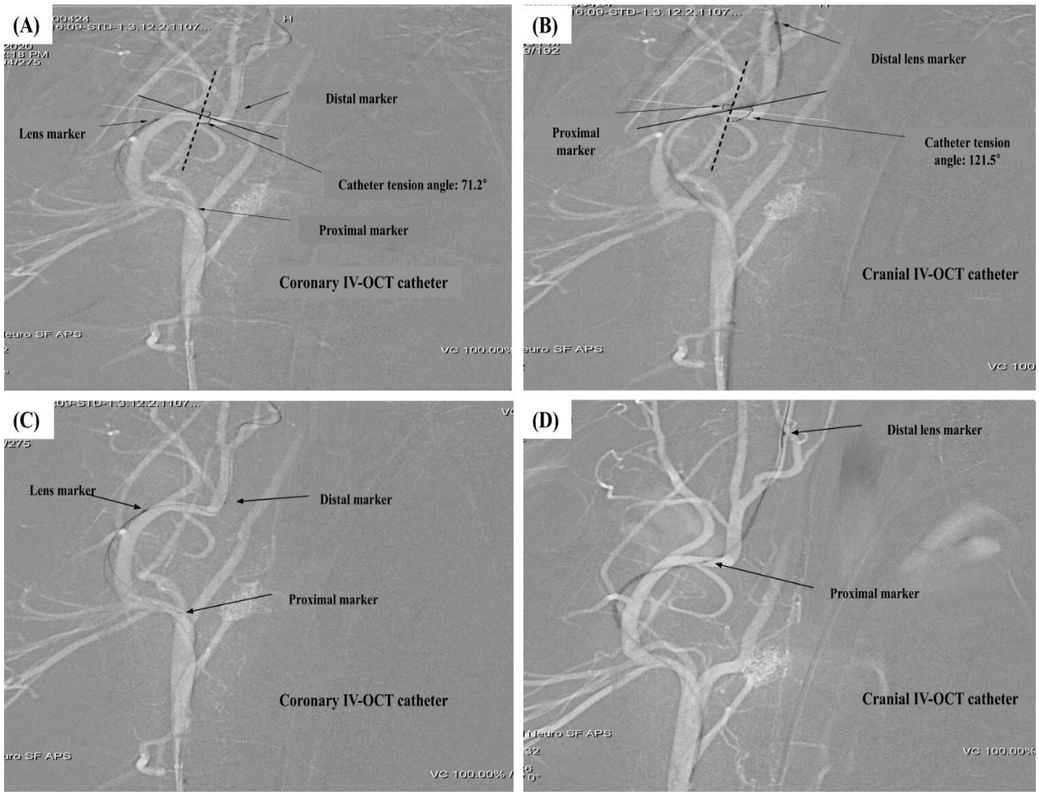 8]. These devices are often mechanically incompatible with the low-profile neurovascular microcatheters routinely employed in endovascular procedures. Specifically, the increased shaft stiffness and limited over-the-wire segment impede advancement through sharply angulated vessels, particularly in the anterior circulation. For example, the monorail Dragonfly IV-OCT catheter (St. Jude Medical, St. Paul, MN, USA), while widely adopted in cardiovascular practice, exhibits a short over-the-wire configuration and high shaft flexibility—features that hinder its navigability in the complex intracranial anatomy [