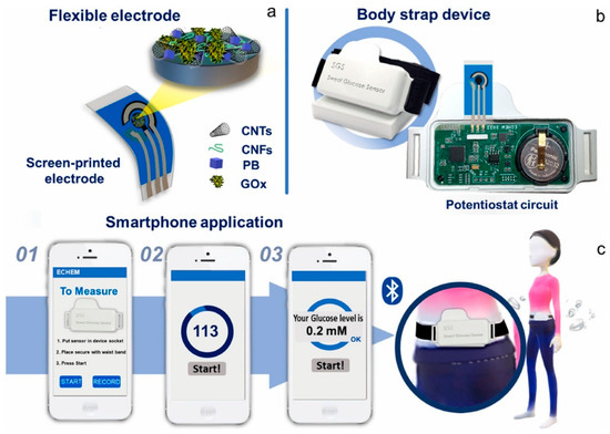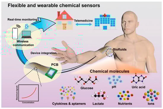 - Qiao, Y.; Qiao, L.; Chen, Z.; Liu, B.; Gao, L.; Zhang, L. Wearable Sensor for Continuous Sweat Biomarker Monitoring. Chemosensors 2022, 10, 273. [Google Scholar] [CrossRef]